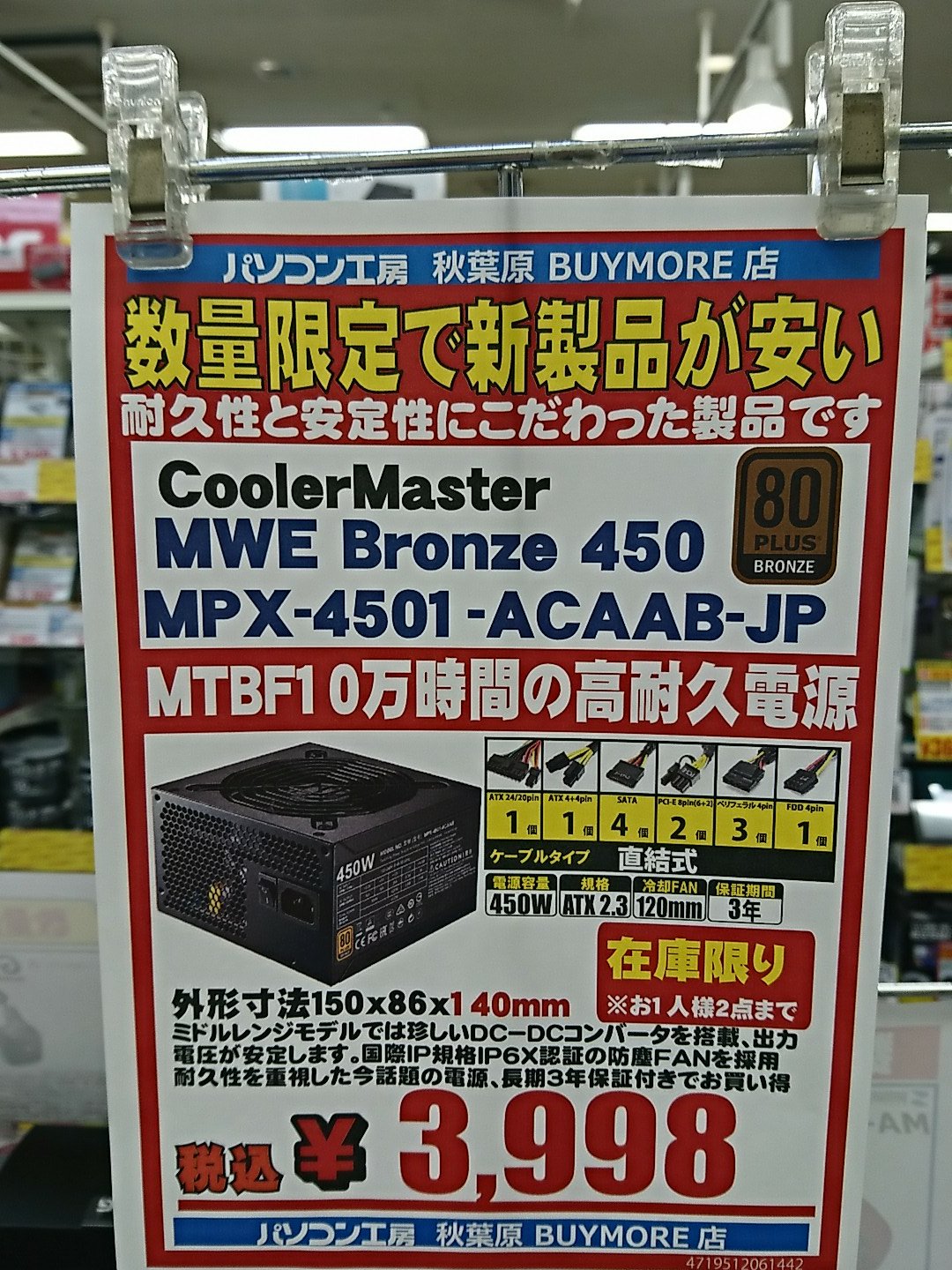 Pc Diy Shop Freet On Twitter お安い電源1 Coolermaster Mpx 4501 Acaab Jp 3 998 税込 80銅の直結式450w Atx電源ですが 中々の使用部材で5kアンダー電源では担当イチオシとか Sata電源ポートx4なのでストレージの多い人は厳しいですが 激安シンプル環境では